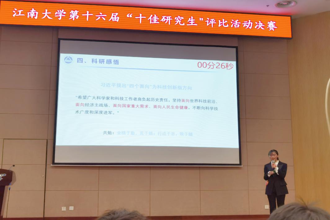 研究生李月一路过关斩将,顺利成为“十佳研究生”候选人,入围决赛(全校共15名)。在决赛环节,各位优秀研究生依次进行个人展示、专题问答和观众投票,经过激烈角逐,李月以第3名的优异成绩荣获爱一帆