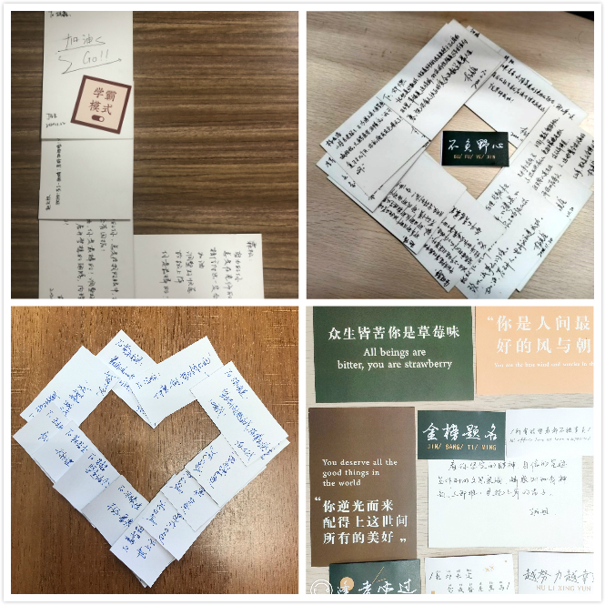 学院为每一位考研学子精心准备了定制版“考研大礼包”:纯牛奶、能量棒、印有学生姓名的罐装可口可乐以及由各班班主任亲笔书写的专属加油明信片,每一份礼品都饱含着学院对考研学子的深深祝福和殷切关怀。同学们与手持考研加油牌的班主任、辅导员老师以及班级同学合影留念,喜悦的笑容展现出备考的信心与冲刺的决心。