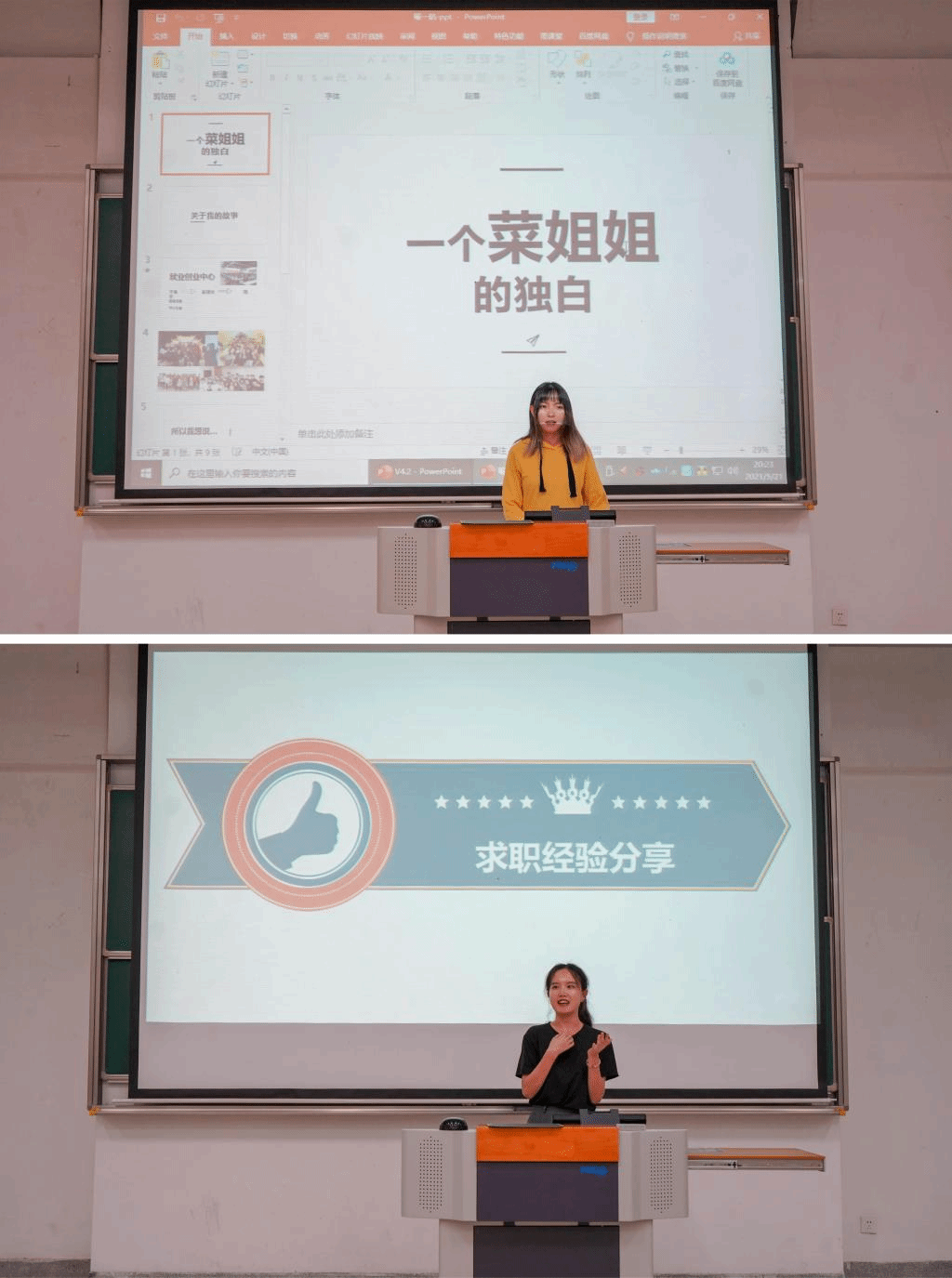 张欣列举了自己常用的求职资源公众号、app、网站等,强调了简历的格式、内容,以及开展自我介绍的要点。喻一航分享了自己在校期间的社团工作经历,强调同学们要有自己的规划。