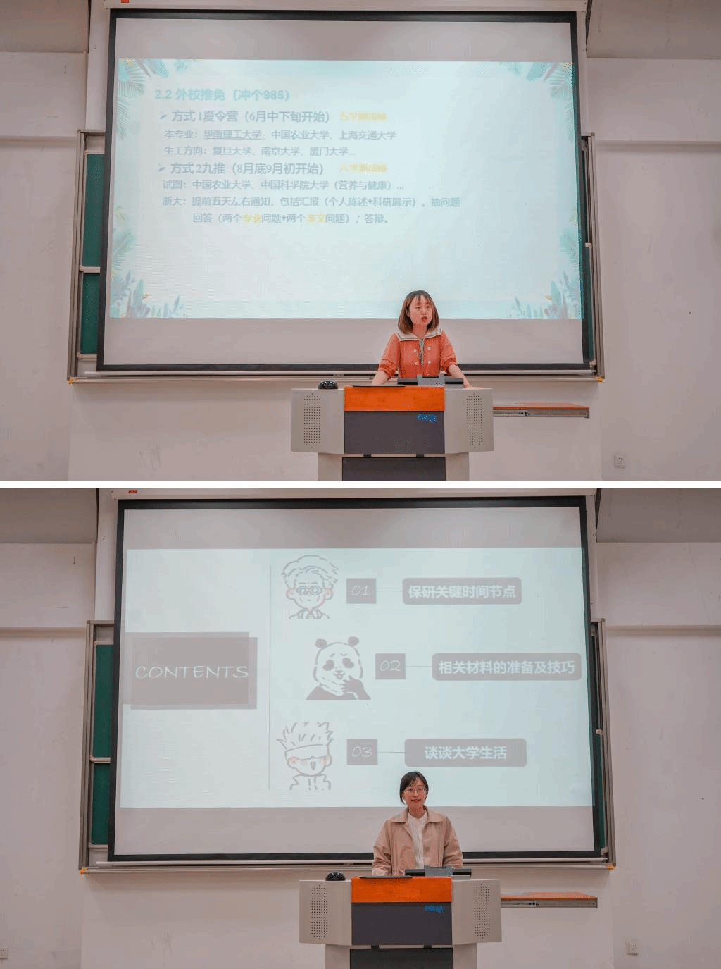 活动伊始,主持人陈嫣针对本次活动的目的进行了讲解,并分享了自己保研到浙江大学的经验,说明了保研过程中起到帮助作用的荣誉奖项,保外校可参加夏令营,以及同学们需要提前了解的学硕、专硕、直博之间的区别,并告诫低年级同学们现阶段需要掌握专业知识,提升英语能力,做出科研成果。周叶蕾提醒同学们在保研阶段注意时间节点,关注院校信息,准备相关材料,并分享了她的大学生活感悟。