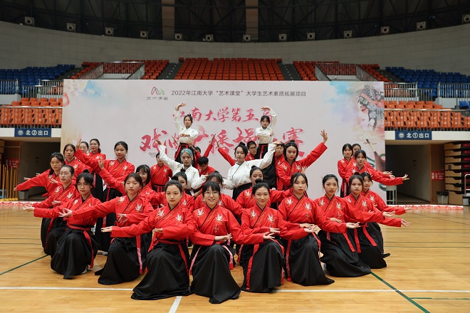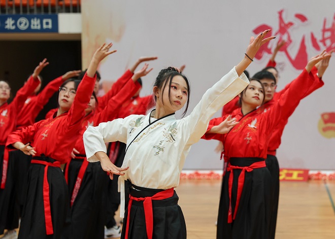 的选手们入场井然有序,动作整齐划一,或长袖飘飖、裙袂生风;或蛾眉轻敛、素手成拳,食品学子在比赛中精神饱满、动作整齐划一,赢得了在场观众的阵阵掌声。表演最后,我院参赛选手打出“江南食品人,敢为先下先”的标语,展现出食品学子朝气蓬勃的青春风采。