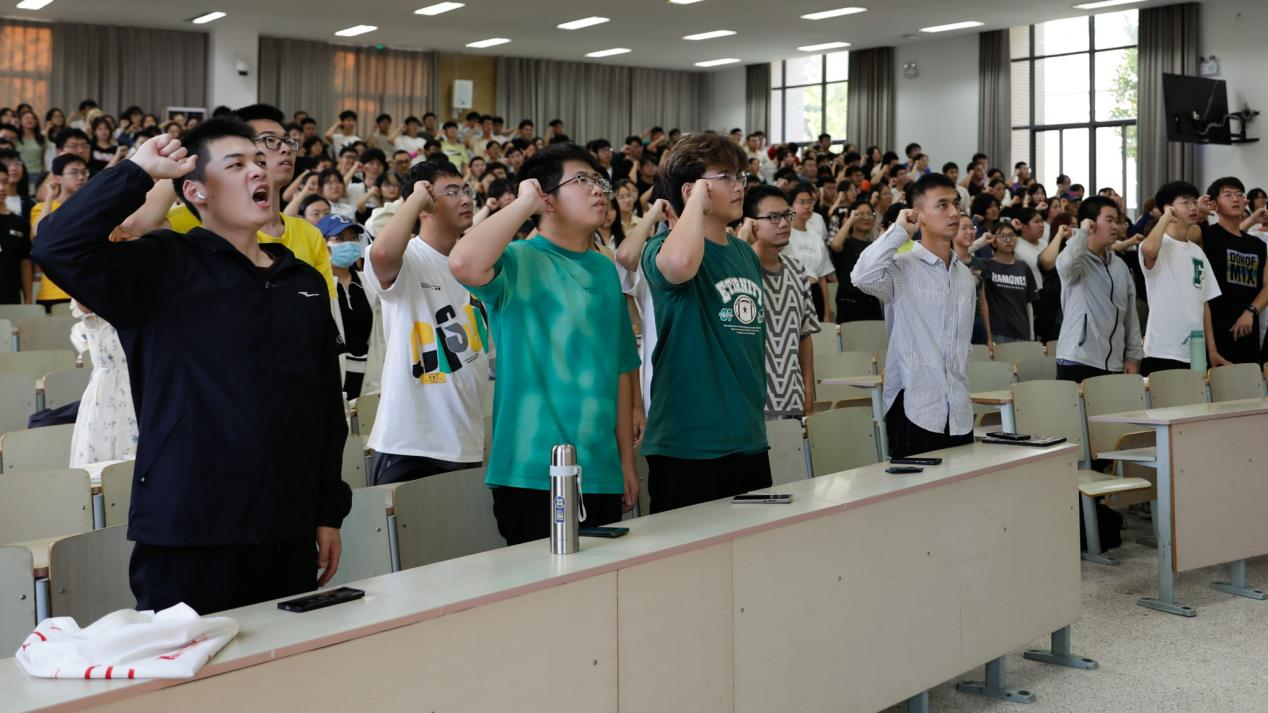 退伍大学生士兵胡加恩发言。他讲述了自己在部队两年的经历,号召同学们勇担时代责任、主动投身军训、锤炼意志品质,努力成长为堪当民族复兴大任的食代新人。食科2206班韩书峤带领全体同学庄严宣誓,将严格遵守纪律,认真投入军训,发扬团队精神,续写食品荣光。
