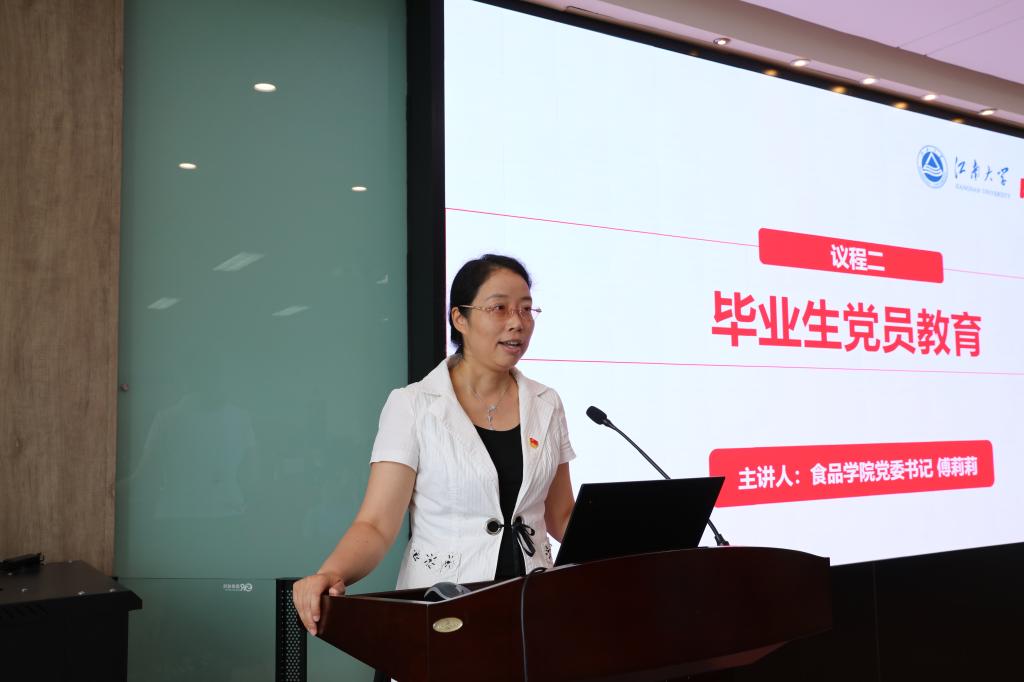 首先,傅莉莉书记做毕业生党员离校教育。她指出,共产党员是一个光荣的称号,更是一份责任与使命,希望大家始终发挥党员先锋模范带头作用,并提出三点期望。一是不忘初心、牢记使命。希望大家提高政治意识、学会常寻初心、加强思想学习、注重实践积累,永葆共产党人的初心。二是恪守正道,敢于创新。既要遵守党规党纪、法律法规、规章制度,又要恪守专业之道。在此基础上,善于发现勇于创新,将所学服务于国家需要,推动中国食品行业的发展。三是勤勉有为,展现风采。希望大家始终铭记“勤业、创新、争先、共赢”的院训,将在爱一帆