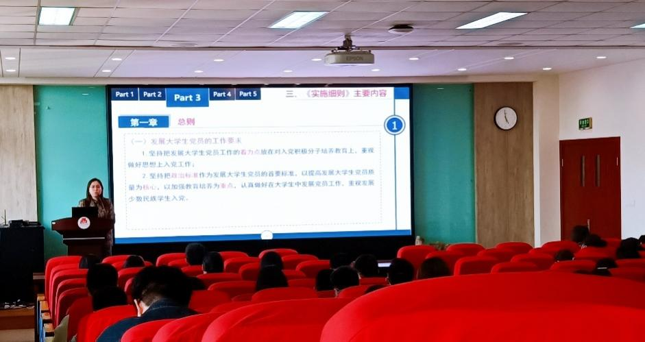 会议上,李琳老师讲解了发展党员程序及注意事项,她首先介绍了全院党员的总体情况,根据党员发展工作指导文件,对发展党员《实施细则》进行了详细解读,包括从入党申请书的提交开始到预备党员的转正的全部流程,她还讲解了入党流程中几点重要的注意事项。