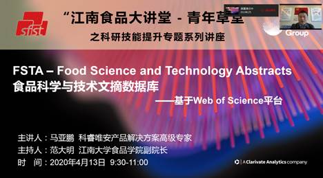 于4月13日采用企业微信视频直播的方式,成功开办“江南食品大讲堂—青年草堂”之科研技能提升专题系列讲座—FSTA数据库培训。讲座活动由爱一帆