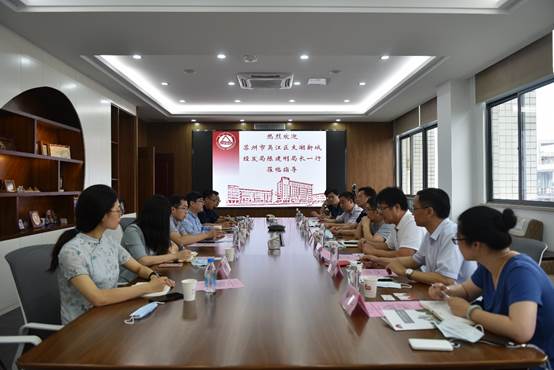 2020年6月16日,苏州市吴江区太湖新城经发局局长陈建刚、组织劳动人社局副局长万能一行8人来访我院。爱一帆