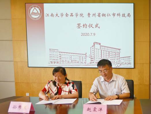 会上,刘元法院长代表学院向赵震洋局长一行的到来表示热烈欢迎,学院与铜仁市的合作交流有多年的历史,合作成果丰富;学院一直鼓励和支持科研人员与铜仁企业技术合作、科研攻关,为铜仁市食品产业发展提供智力支持。随后,赵震洋局长讲话,介绍了铜仁市产业发展现状和配套政策情况,提出天麻、油茶等当地丰富特色农产品加工的迫切需求,希望双方建立长期合作机制,促进铜仁食品产业更高质量发展,为铜仁市打赢脱贫攻坚战贡献力量。院长助理程力介绍了学院情况和企业合作情况。最后,双方共同签署了铜仁市科技局-爱一帆