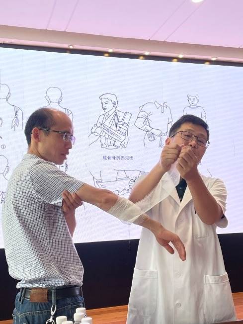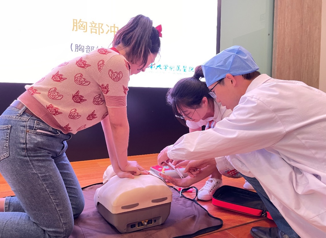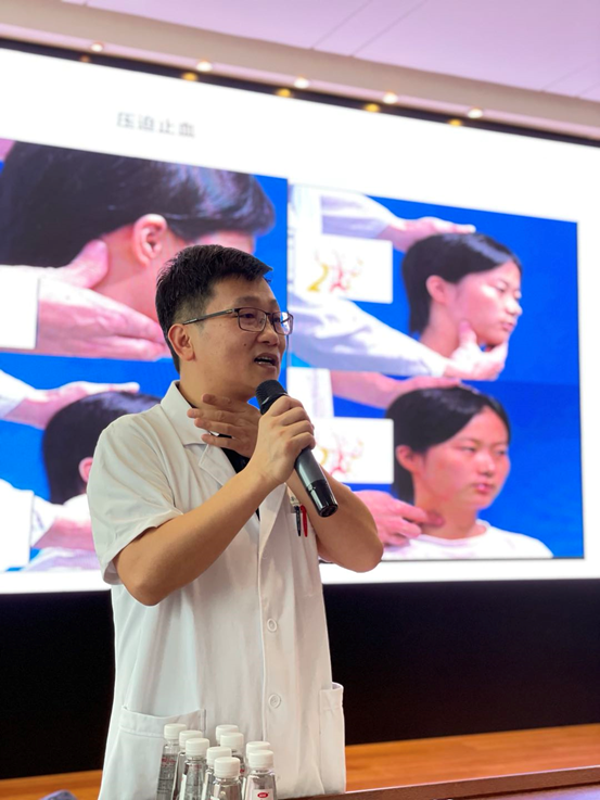 附属医院全科医学科副主任医师成洲教授、贾代林医师为全院师生上了一堂干货满满的急救科普实操课——“急救知识”,共计近百名师生参加。三位医生以实践操作的方式,手把手向师生讲授心肺复苏、电除颤AED、海姆立克急救法、实验室应急处理、环境及理化因素损伤、社区/家庭意外伤害等应急处理实操措施。现场师生非常热情地参与、提问、学习,在医生实际演练时,纷纷上前观摩,主动报名参加现场动手实操。人人学急救,急救为人人。通过这堂理论知识培训和实践操作演练,师生们学到了如何在医护人员到达前,按医学护理原则,利用手边素材进行初步救援和护理。作为高校师生,非常有必要掌握常用的急诊急救知识,有利于更合理更科学地处理好身边可能遇到的紧急情况。