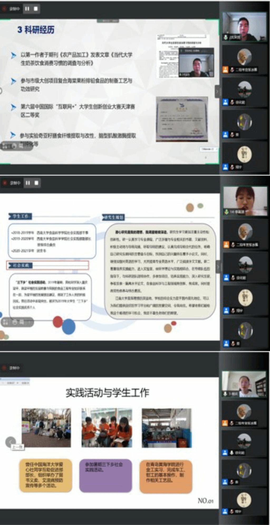 2020级研究生刘羿飞分享了自己从夏令营营员到江南食品人这一年的角色转变历程,他积极动员大家报考江南食品,实现人生梦想。成向荣老师为大家讲解了本次夏令营的相关情况,期待同学们来江南食品收获更多知识。严瑞芳老师介绍了2021年推免、考研的相关情况。最后,孙秀兰教授作总结讲话,她充分肯定了同学们的出色表现,基于不同视角向同学们提出了恳切的建议,欢迎大家加入爱一帆