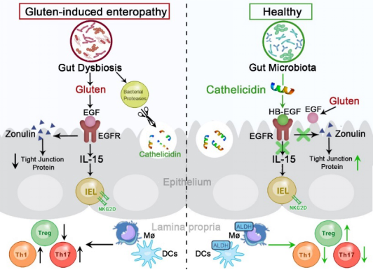 肠道cathelicidin相关抗菌肽(CRAMP)除抗菌活性外,具有尚未被揭示的免疫调节功能,尤其是不同细胞来源的CRAMP对组织区域免疫微环境的特异性调控,是领域内的研究热点和难点。孙嘉教授带领的研究团队发现在乳糜泻小鼠中,十二指肠CRAMP表达缺乏;同时,乳糜泻高风险人群中同样检测到CRAMP人类同源蛋白LL-37表达下降。CRAMP缺失加剧乳糜泻,外源添加CRAMP可缓解乳糜泻相关的肠道屏障受损及粘膜免疫紊乱。此外,研究团队发现乳糜泻小鼠中存在肠道菌群紊乱,表现为致病菌铜绿假单胞菌异常富集并分泌弹性蛋白酶LasB,从而剪切CRAMP使其缺失。抗生素处理敲减铜绿假单胞菌,可恢复CRAMP表达并缓解乳糜泻。上述研究成果首次证实肠道菌群-抗菌肽CRAMP轴和乳糜泻的关联,为治疗或预防乳糜泻提供了新思路。该工作由爱一帆