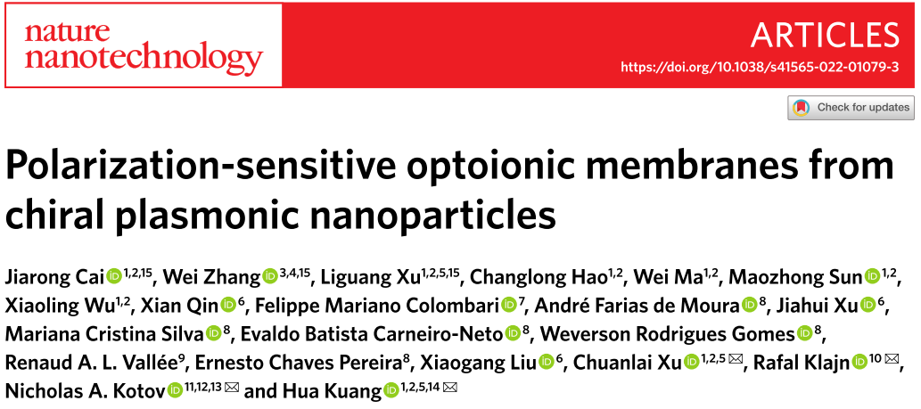 胥传来教授团队受螳螂虾启发,利用金纳米颗粒自组装排列形成手性纳米膜,实现了圆偏振光的精准区分与识别,研究工作以Polarization-sensitive optoionic membranes from chiral plasmonic nanoparticles为题,于2022年3月14日24时在《自然·纳米技术》(Nature Nanotechnology)期刊上在线发表( //www.nature.com/articles/s41565-022-01079-3)。
