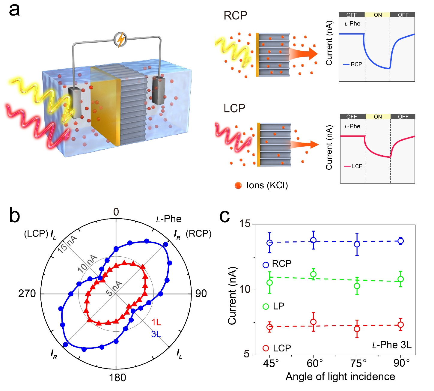 图1.(a)手性光离子膜在CPL照射下的电化学测试装置及手性光离子膜的CPL识别示意图。(b)单层和三层l-Phe修饰的手性纳米薄膜光电流极化依赖性的极坐标图。(c)三层l-Phe修饰的纳米薄膜在不同入射角的CPL光照射下的电流统计。入射角指光与纳米薄膜表面之间的角度。
