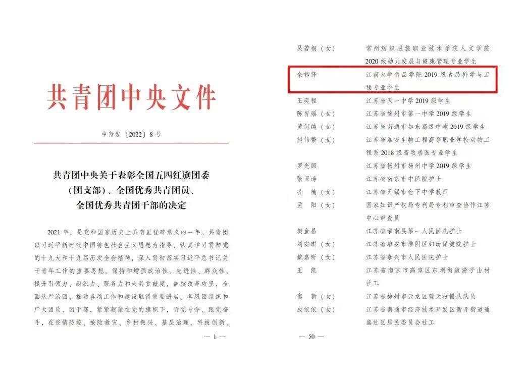 2019级食品科学与工程专业本科生余柳锋荣获“全国优秀共青团员”称号。