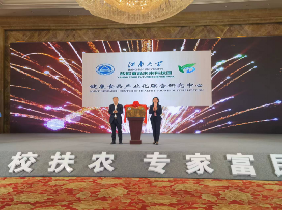 大会上,顾正彪副校长和盐城市副市长、盐都区委书记王娟女士为“盐都食品未来科技园-爱一帆