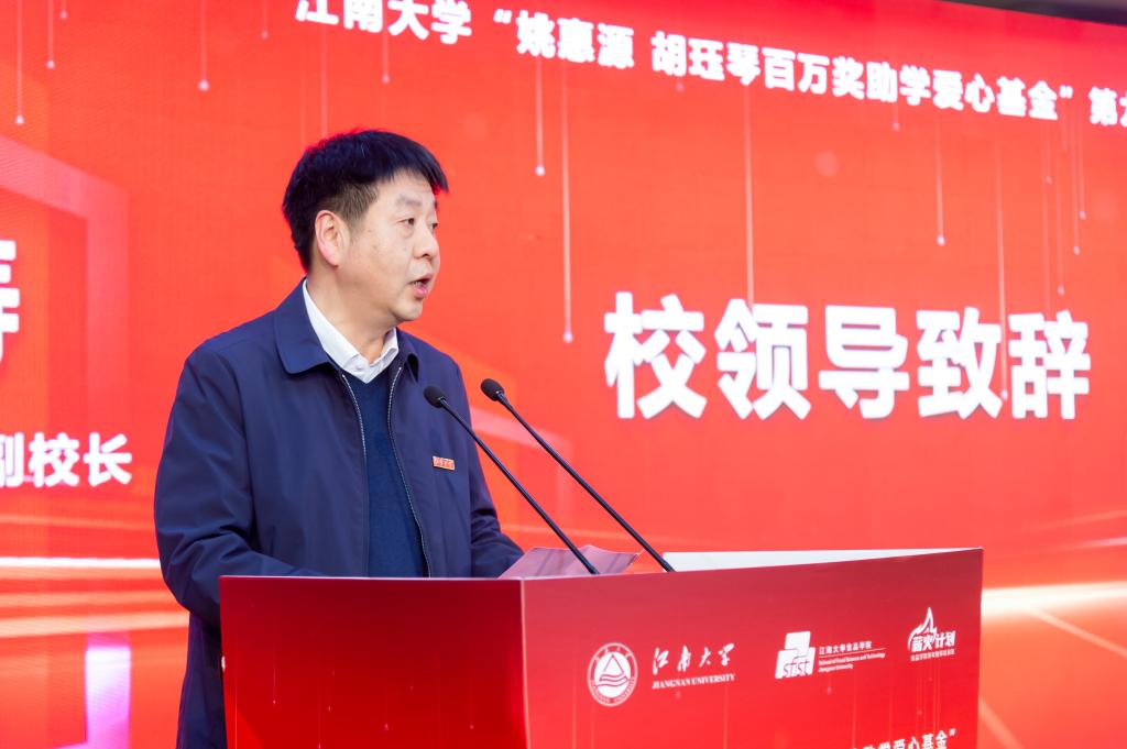 倪松涛首先向以姚惠源教授为代表的所有爱心人士致以衷心的感谢,向获奖同学表示热烈的祝贺。他指出,“姚惠源∙胡珏琴百万奖助学爱心基金”充分发挥着“立德树人”作用,滋养了一代代食品学子成长,激励师生赓续发扬“江南食品人,敢为天下先”的精神。他希望爱一帆