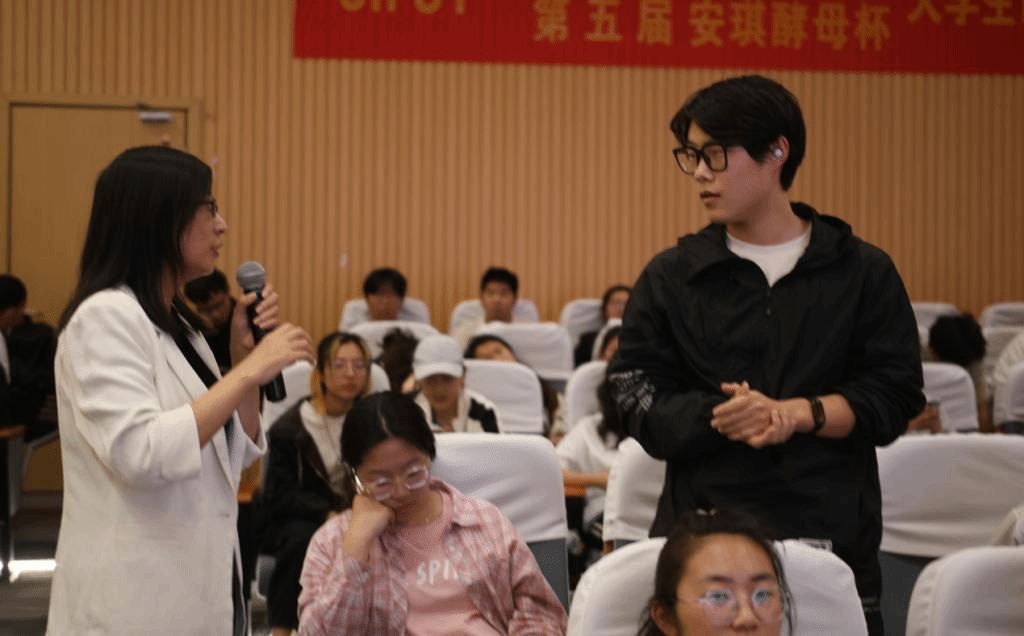 蔡天韵、张小丽分别介绍盼盼食品、安琪酵母的起源与发展,并普及了全谷物食品相关知识、产品保质方法、工业化生产的产品特点等内容。她们鼓励同学们主动发挥食品学科交叉互融优势,打造富有创新性和竞争力的作品。