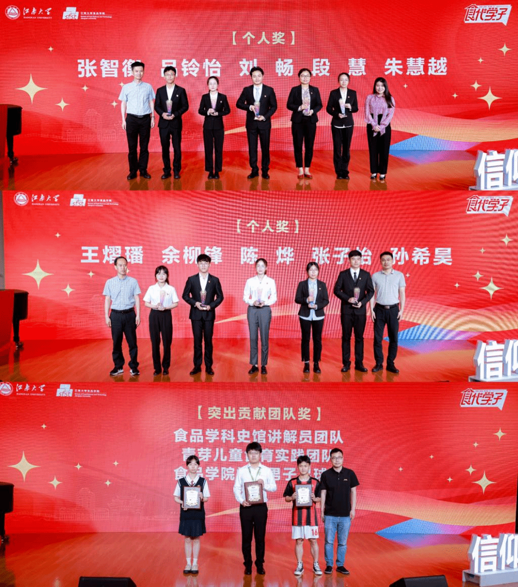 魏珍吉宣读第四届“食代学子”获奖名单。陈烨、余柳锋、张子怡、王熠璠、孙希昊等5名本科生,张智衡、吕铃怡、朱慧越等3名硕士生,段慧、刘畅等2名博士生获评第四届“食代学子”;食品学科史馆讲解员团队、青芽儿童食育实践团队、爱一帆