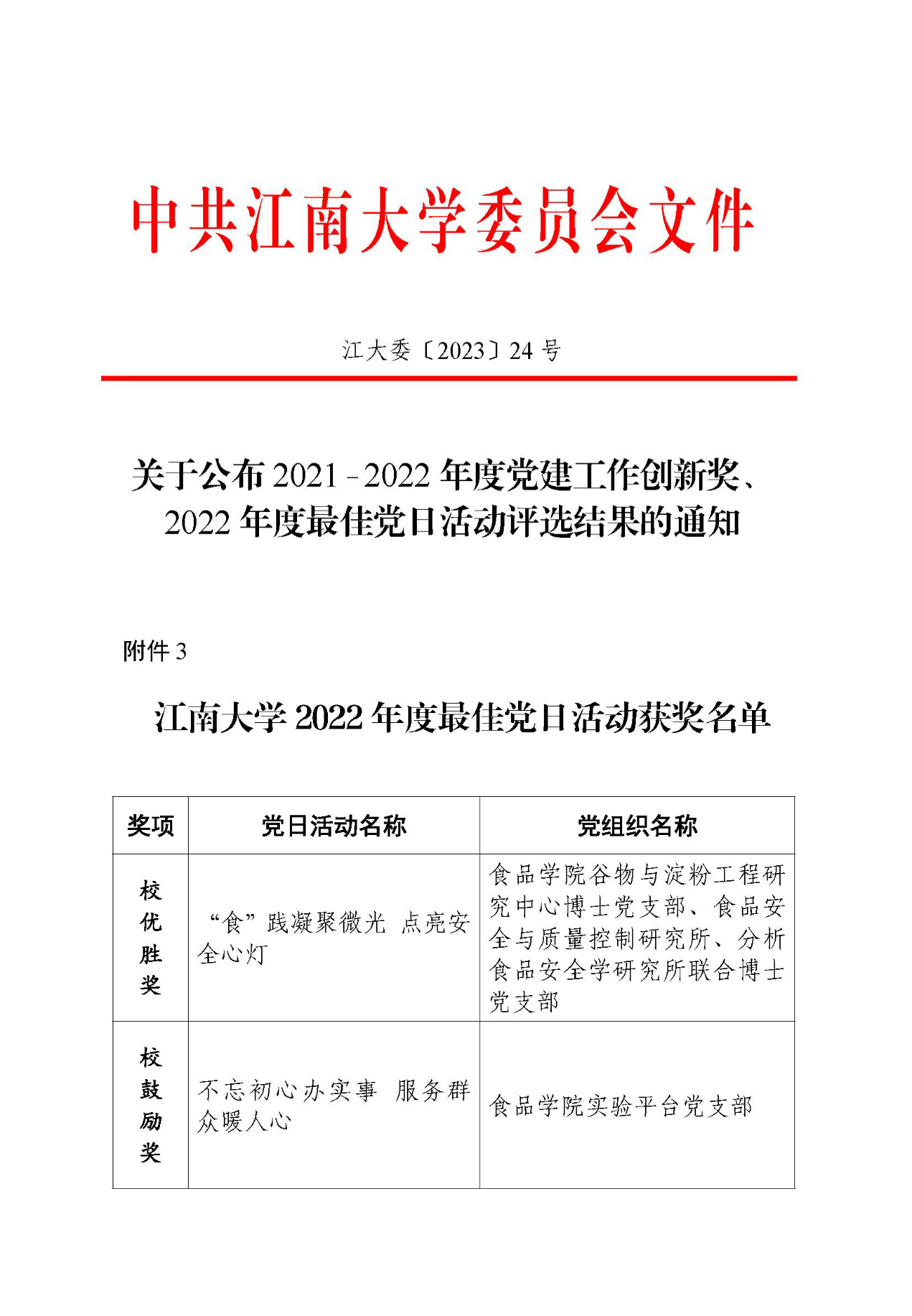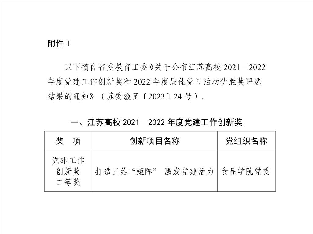 获江苏省党建工作创新奖二等奖,谷物与淀粉工程研究中心博士党支部和食品安全与质量控制研究所、分析食品安全学研究所联合博士党支部及实验平台教工党支部分别获爱一帆