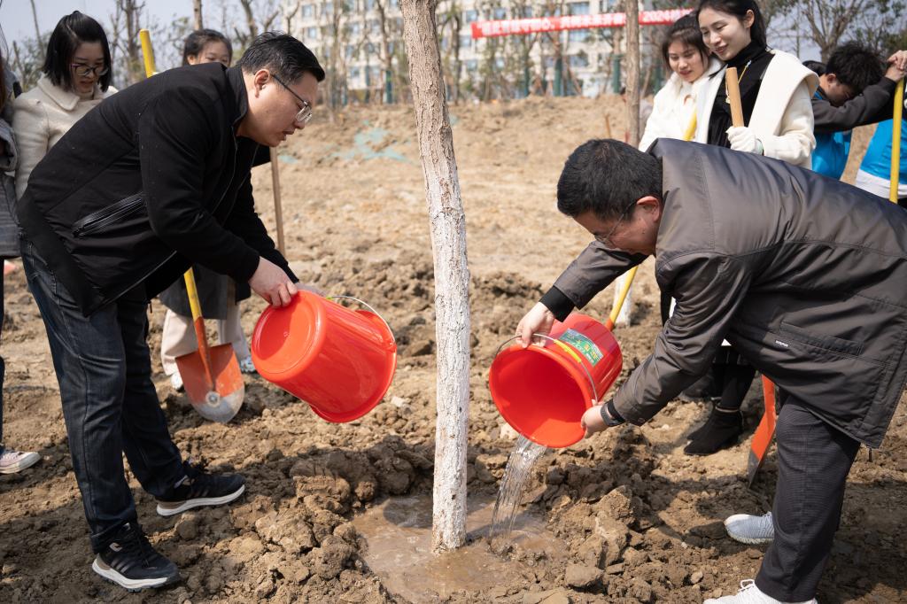 首先由环境中心富有植树经验的员工进行栽种树木的方法讲解和现场演示。随后,师生们领取铁锹与水桶等工具进入场地,有条不紊地立苗、培土、浇水,齐心协力种下一棵棵银杏树苗,焕发出春天的希望。大家脸上无不洋溢着喜悦的笑容。十年树木,百年树人。本次活动的成功举办为校园的靓丽风景再添新绿,通过劳动教育的方式强化了师生共同协作的能力,也进一步树立了校园环保意识,为打造低碳中国献出绵薄之力。
