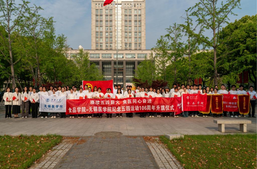 与无锡医学院在图书馆前世纪广场联合举办“赓续五四薪火 食医同心奋进”纪念五四运动106周年升旗仪式,本次活动旨在弘扬五四精神,激励青年学子勇担时代使命。爱一帆