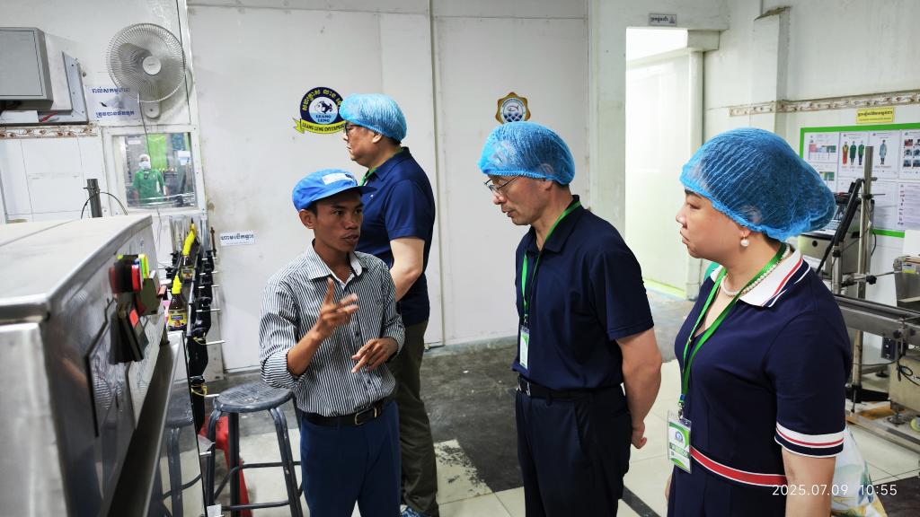 访问团还实地考察Ny Eang Neng(鱼露加工企业)、Cambodia Fresh Farm(冷冻鱼制品加工企业)、Leang Leng Enterprise(调味品加工企业)、Golden Yem(营养米粉加工企业)等,参观企业加工生产线,详细了解企业原料供应、产品品系、产销情况等基本信息,并与企业负责人、研发人员交流现有工艺方案与加工产线所存在的局限性及对产品生产效率、安全性的潜在风险,并针对新产品研制、生产工艺优化、自动化装备更替、生产安全意识培训等方面提供可行性建议与定向指导。