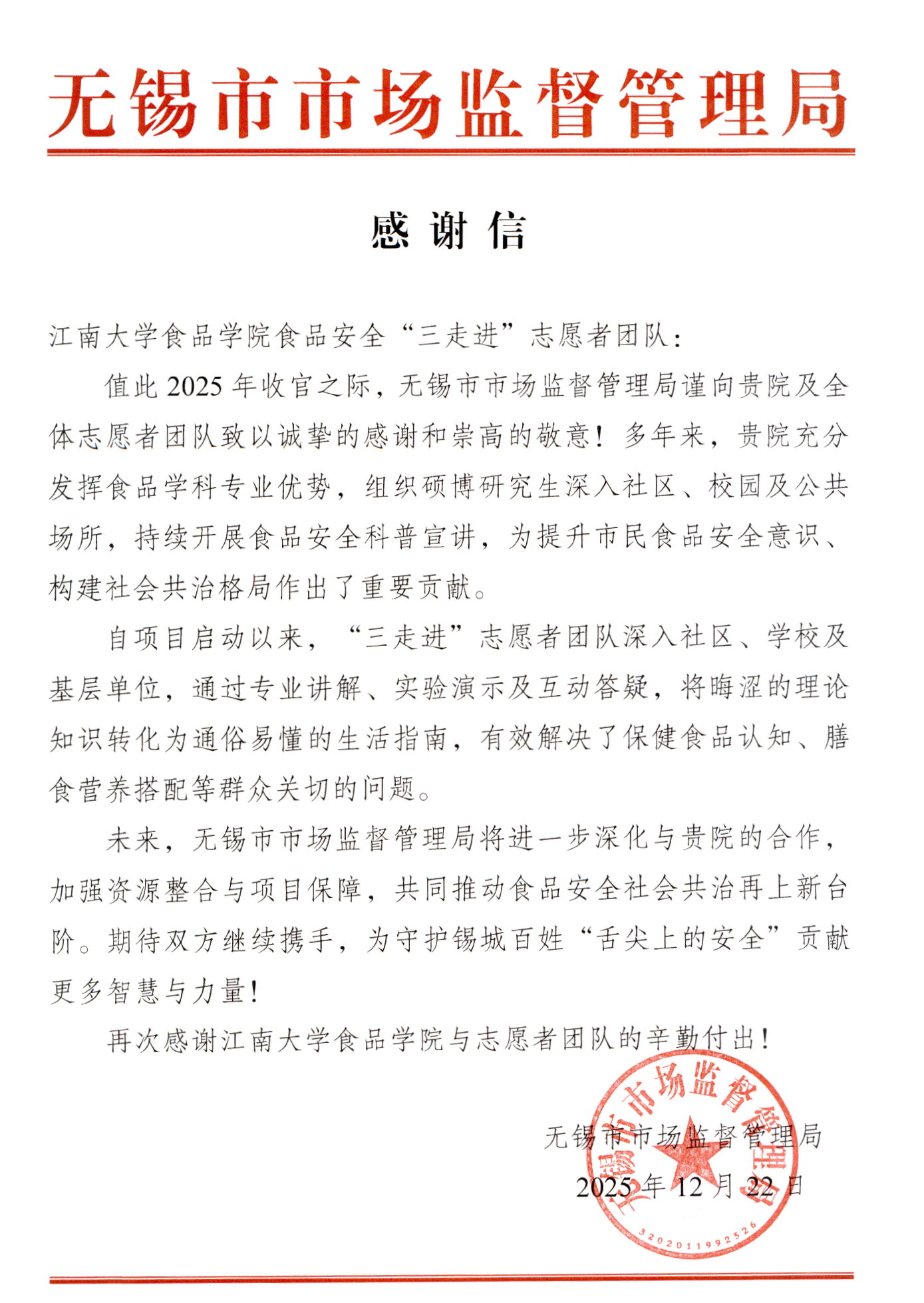 团队与无锡市市场监督管理局长期以来保持着紧密的合作关系。近日,市局特别向学院及全体志愿者团队发来感谢信,对双方在食品安全社会共治方面的协作成果给予充分肯定。感谢信是对我们双方携手服务社会、共建食安防线工作的生动注脚,也为未来的合作注入了更强的信心。展望新征程,希望爱一帆