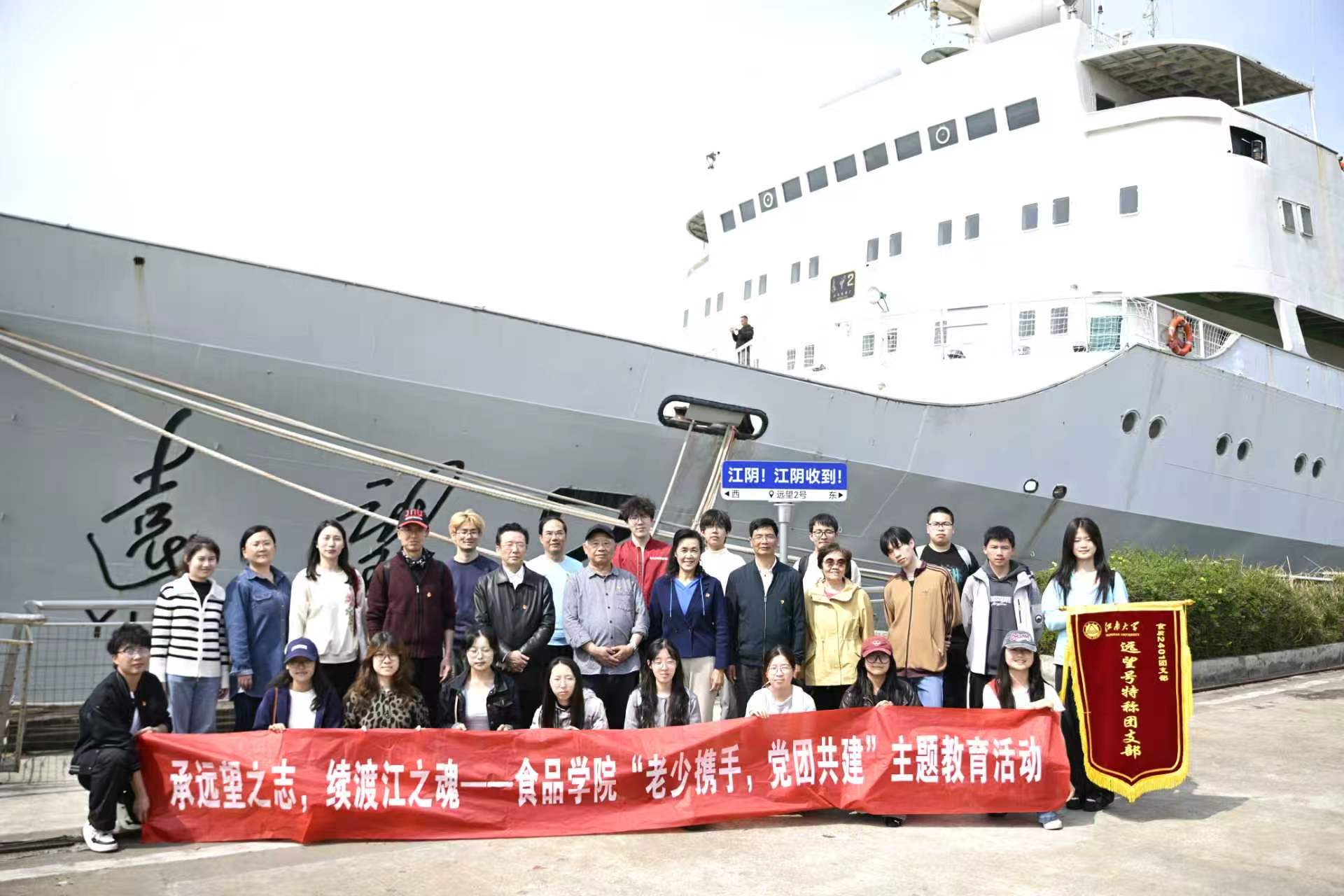 下午师生一行来到江阴远望二号基地。作为我国航天远洋测控事业的功勋船舶,远望二号承载着几代科技工作者的奋斗与荣光。在讲解员的带领下,大家登上测量船,近距离参观驾驶舱、测控设备舱等核心区域,详细了解远望号的发展历程与辉煌成就。老党员与青年团员不时交流互动,老同志们结合自身工作经历,讲述当年艰苦创业、勇攀高峰的故事;青年团员们则围绕科技创新、报国志向踊跃提问,现场气氛热烈而温馨。