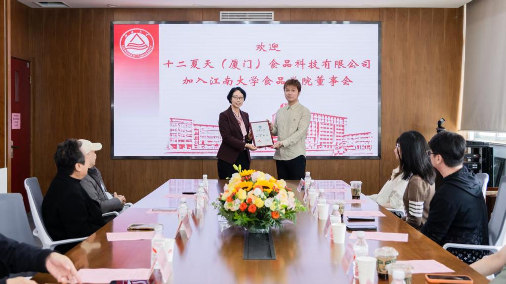 党委书记傅莉莉为十二夏天(厦门)食品科技有限公司颁发董事单位证书。傅莉莉在致辞中深情回顾了新中国成立以来的华侨奋斗史,对十二夏天加入学院董事会助力学科发展、支持学生科创及推动成果转化的务实举措表示热烈欢迎与衷心感谢。她指出,这不仅是产教融合、产学研用协同创新的生动实践,更是食品领域国际合作的务实体现。