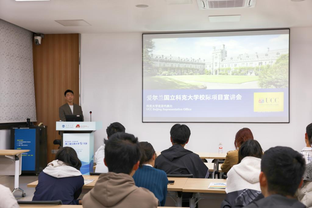 UCC北京代表处招聘专员赵子豪为学院本科生作联合培养项目宣讲,详细介绍项目的课程设置、申请条件及奖学金政策。该项目旨在为爱一帆