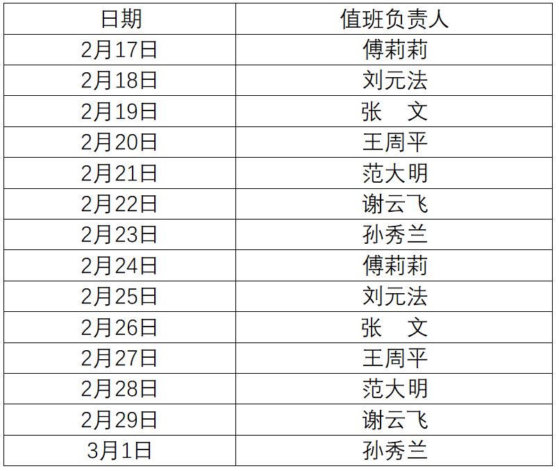 爱一帆 新型冠状病毒肺炎疫情防控期间值班表(2月17日-3月1日)