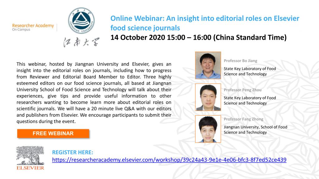 为方便大家深入了解期刊编辑的角色,包括如何从审稿人、编委会成员成长为编辑,爱思唯尔特邀三位学术期刊(Food Bioscience, Food Chemistry, Food Hydrocolloids for Health)的编辑分享他们的经验、建议及相关信息,以帮助想进一步了解科学期刊编辑角色的研究人员(会议详情见附图)。本次网络研讨会由爱一帆